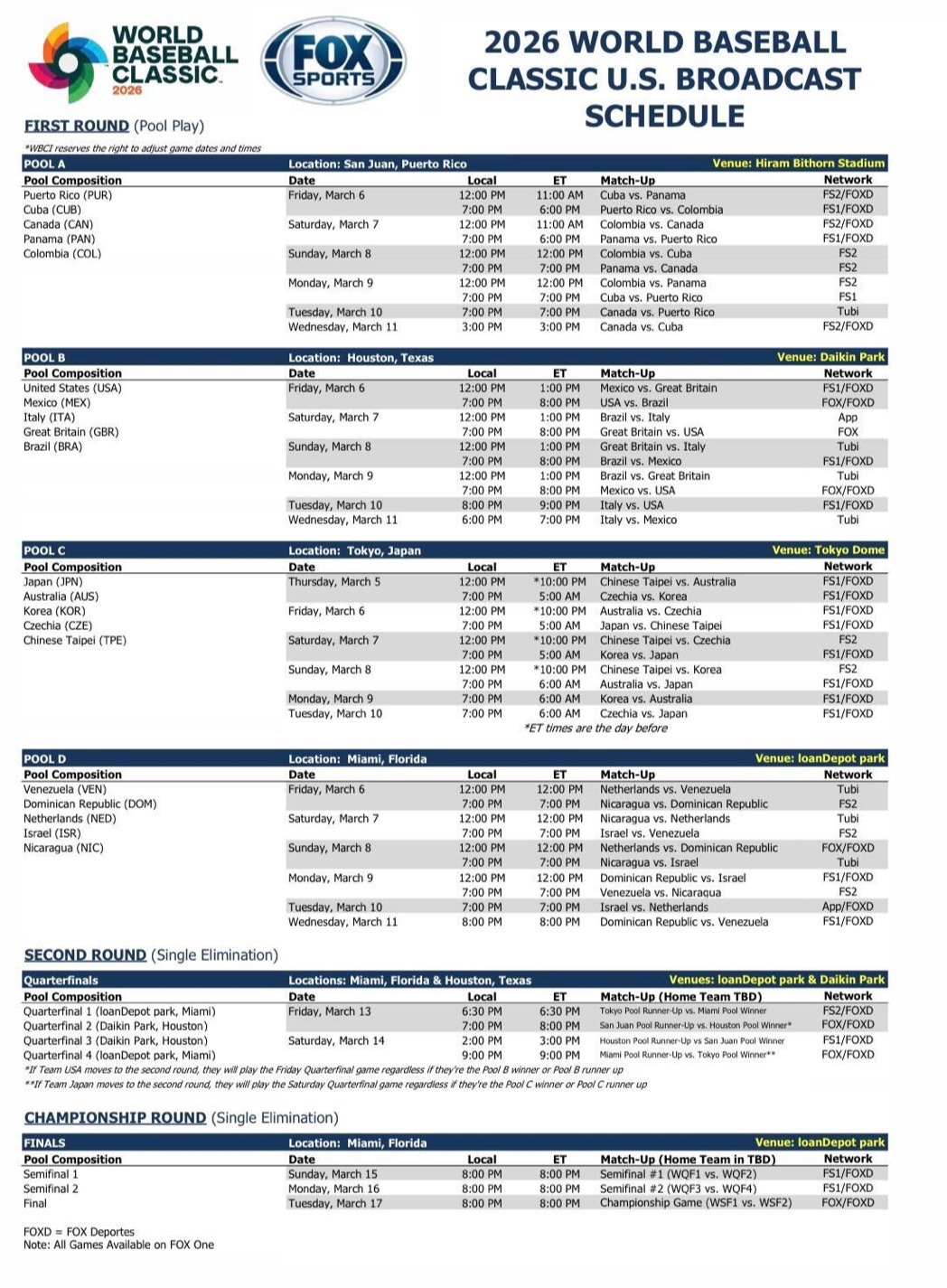 In case you are wondering, the World Baseball Classic gets underway tomorrow. Here is the schedule: