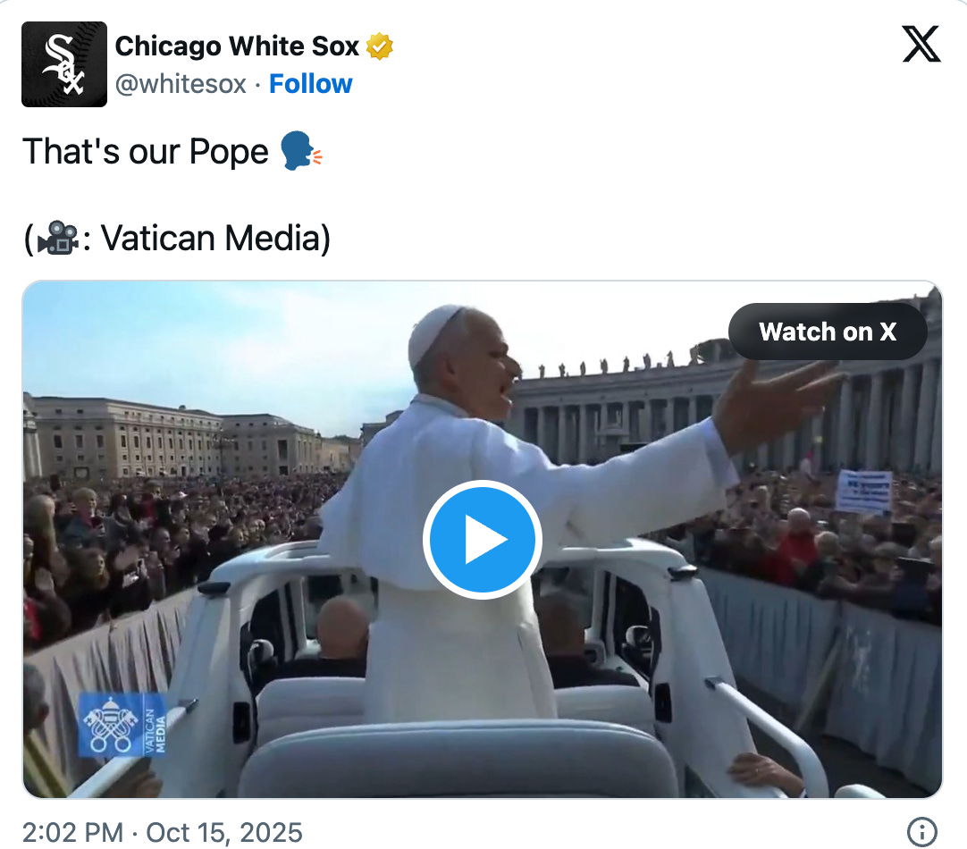 In your wildest dreams, could you ever imagine the Pope giving it to a Cubs fan? It happened on Wednesday as Illinois-born Pope Leo XIV, riding in the Popemobile in Vatican Square, heard someone yell: “Go Cubs!” The Pope, who grew up a White Sox fan and attended the 2005 World Series, won by the White Sox over the Astros, yelled back in both Spanish and English: “Han Perdido! They lost.” Of course, the White Sox were not going to let that one go without acknowledgement on social media: