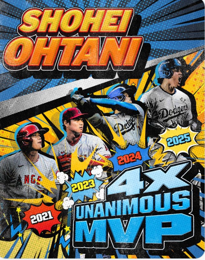 Shohei Ohtani of the Dodgers has won his second straight NL MVP award and once again he wins it unanimously. It is also his fourth MVP overall and he is the only player in MLB history to win the MVP twice in each league. Aaron Judge of the Yankees has won the AL MVP for a second straight season and the third of his career. Judge joins Joe DiMaggio, Mickey Mantle and Yogi Berra as Yankees to win three MVPs.