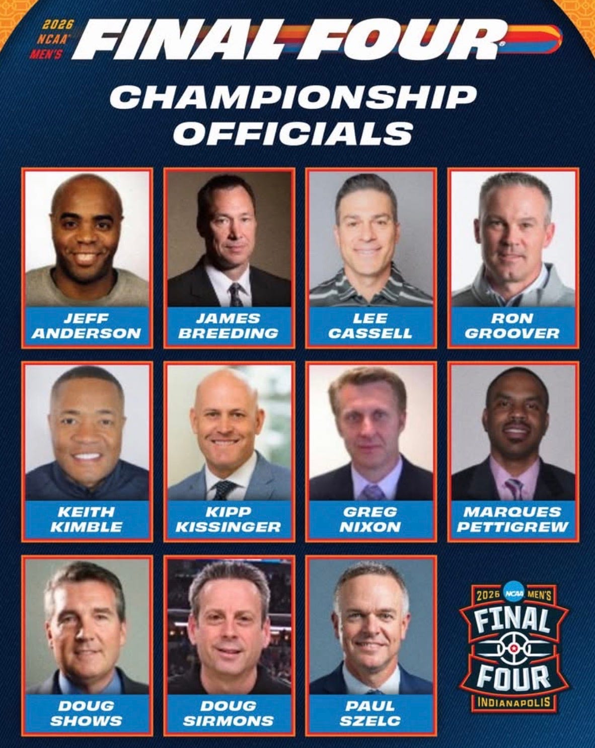 For the record, here are the officials scheduled for the men’s Final Four in Indianapolis: