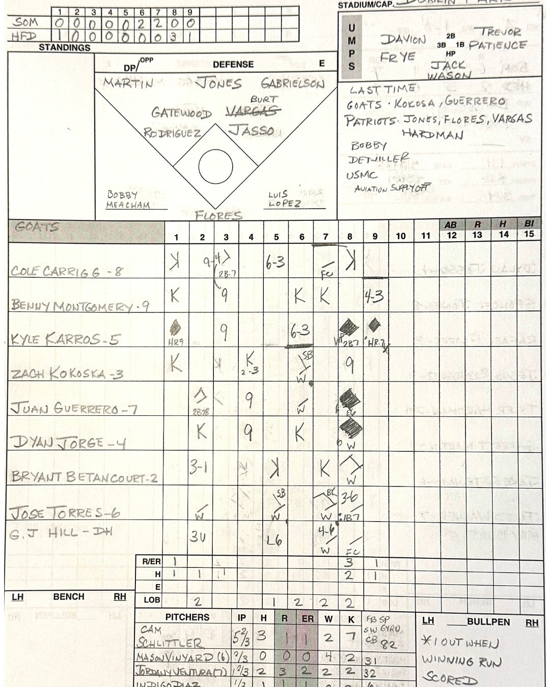 One of the many things I love about baseball is the connection players have. Take Cam Schlittler, who turned in his historical performance in the Yankees win over the Red Sox Thursday night to capture the ALWCS against their rivals. On April 4, Schlittler was the Opening Day starter for the Somerset Patriots against the Hartford Yard Goats at Dunkin’ Park. I broadcast that game, along with the “Voice of the Yard Goats,” Jeff Dooley. Here is my scorecard from that night:
