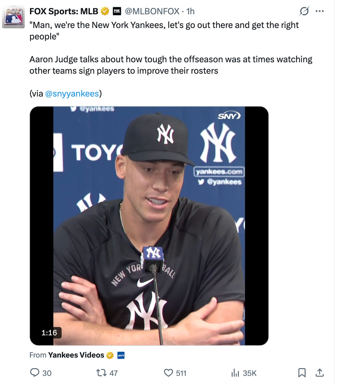 All day long, the New York Yankees were promoting the fact manager Aaron Boone and captain Aaron Judge would appear at a news conference, following the Yankees practice and you could follow it all on the Yankees YES (Gotham Sports) app. Perhaps they wish they hadn’t made such a big deal, because Judge’s comments certainly stirred up a hornet’s nest. When Judge was asked about the Yankees off season, he did not hold back: