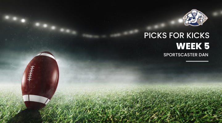 Dan On SportsPicks For Kicks: Week 5 | Ep. 621×0:00Current time: 0:00 / Total time: -3:22-3:22Audio playback is not supported on your browser. Please upgrade.Picks For Kicks: Week 5 | Ep. 62Who will win Pats, Jets and Giants games?Dan LovalloOct 07, 2023ShareTranscriptDiscussion about this episodeCommentsRestacksDan On SportsSportscaster Dan Lovallo comments on the latest in sports and the sports media.Sportscaster Dan Lovallo comments on the latest in sports and the sports media.SubscribeListen onSubstack AppApple PodcastsSpotifyRSS FeedAppears in episodeDan LovalloRecent EpisodesNFL ratings skyrocket/Yankees shakeup the booth11 hrs ago • Dan LovalloBe careful on NBA betting scandalOct 25 • Dan LovalloNBA rocked by gambling allegationsOct 24 • Dan LovalloVlad Jr. or Shohei as World Series MVP?Oct 22 • Dan LovalloThe shot heard 'round ConnecticutOct 21 • Dan LovalloTime to fire Brian Daboll! Now!Oct 20 • Dan LovalloVrabel all classOct 18 • Dan LovalloWhat do Yankees fans want?Oct 17 • Dan Lovallo