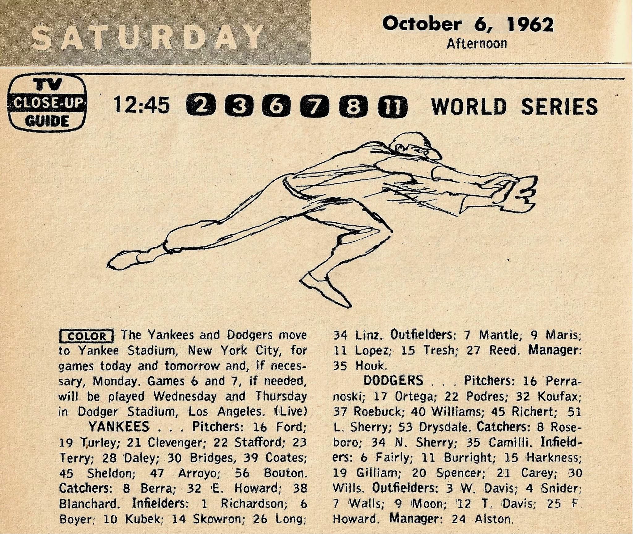There is no need for TV Guide in this day and age, but it was a staple decades ago. The weekly publication was good at providing previews of games in all sports, especially the World Series, when it was a big deal. Because like all publications TV Guide had a deadline, it would sometimes get it wrong. Here was the preview for the 1962 World Series: