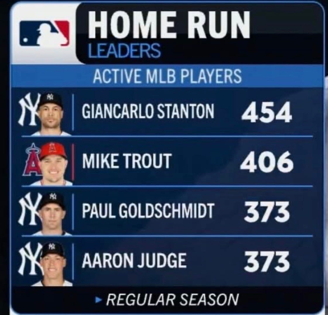The top four active home run leaders in MLB were in last night’s Yankees-Angels game at Yankee Stadium: