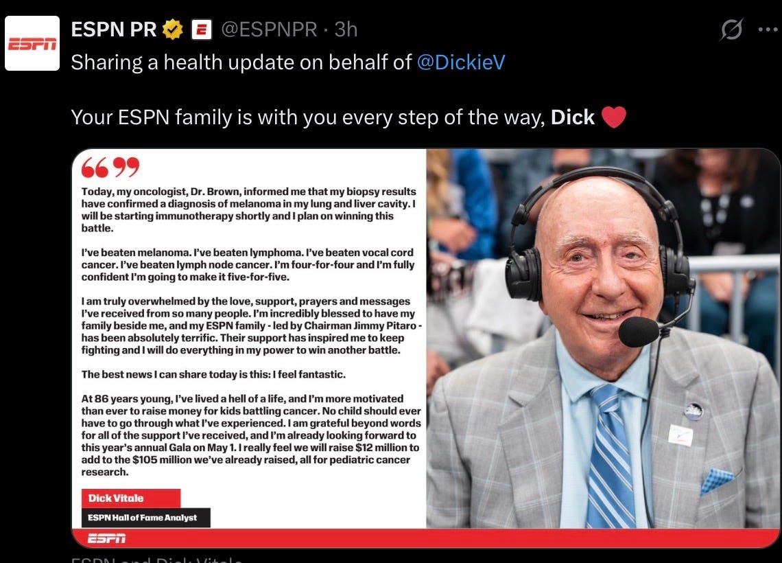 Dick Vitale has been an inspiration for millions, not the least of which is because he has been an open book. In recent years, the 86-year-old Vitale has battled cancer. Yesterday he released the results of his latest pet scan and how he is in another cancer-battle. ESPN also added a social media post on X.