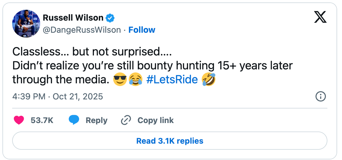Don’t invite Broncos coach Sean Payton and Giants backup QB Russell Wilson to the same party. In what Wilson interpreted as a slight at him, he responded to postgame comments made by Payton after the Broncos dramatic comeback win over the Giants on Sunday. Payton had great praise for Giants rookie QB Jaxson Dart, who replaced Wilson as the Giants starting QB after three games. Remember, Wilson was the Broncos QB under Payton in 2023. “They found a little spark with that quarterback,” Payton said. “I was talking to (Giants owner) John Mara not too long ago, and I said we were hoping that that change would have happened long after our game.” Those comments led Wilson to post the following on social media: