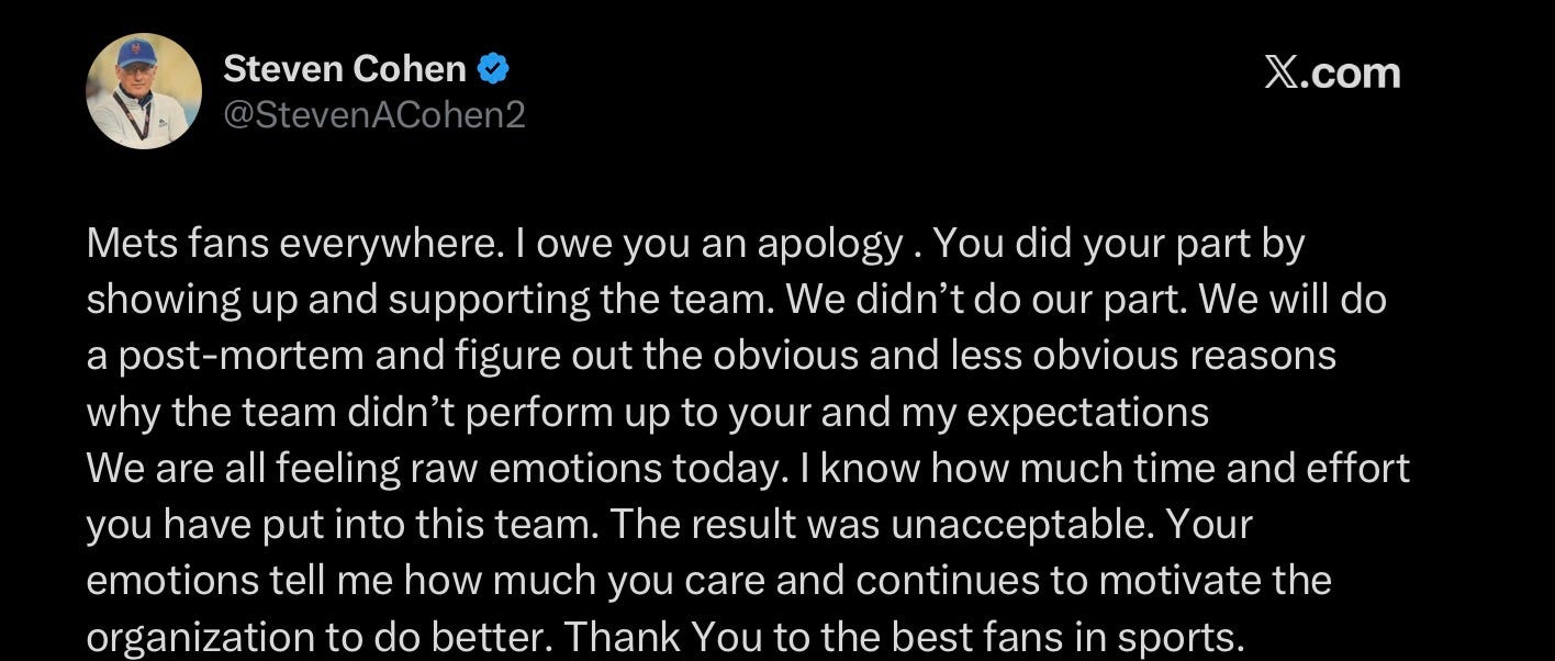 Carlos Mendoza gets a reprieve. The Mets will bring their manager back for a third year, despite a disappointing season. Coming within two games of making the World Series last year, the Mets were expected to make a big playoff push in 2025, what with the mega signing of free agent Juan Soto and baseball’s second highest payroll. But from mid-June the Mets went from baseball’s best record to playing 17 games under .500 (baseball’s fifth worst record) to drop out of the playoff hunt. So disappointing was the Mets season it led owner Steve Cohen to issue a statement of apology. It might not have had the pizzazz of a George Steinbrenner, but it indicated changes will be coming: