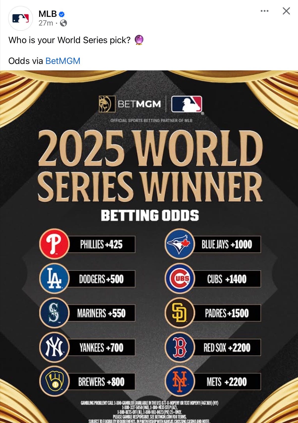 And I leave you with this. I am old enough to remember going to or watching MLB games, where “No Betting” signs were posted everywhere. Watch a game on TV and the shot from the center field camera would show a “No Betting” sign posted on the padding behind home plate. Friday, MLB posted this on its Facebook page: