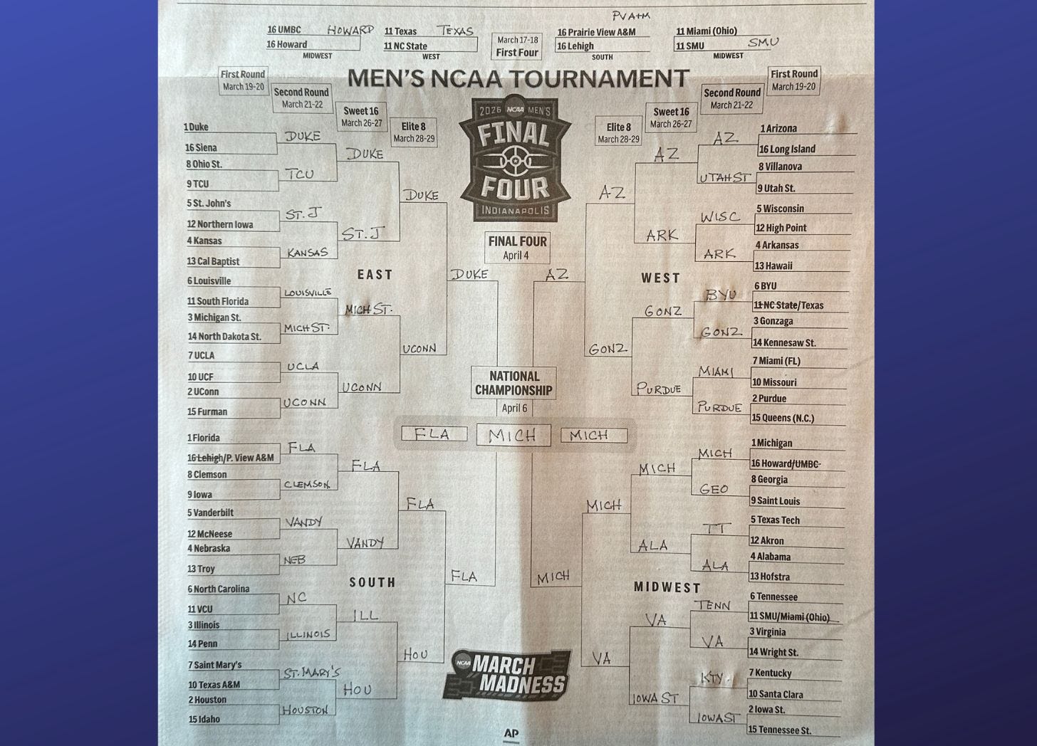 I have filled out my NCAA men’s tournament bracket: